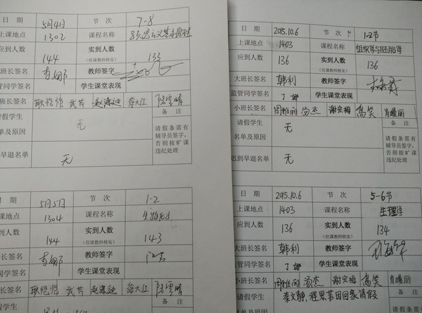 本学期,不仅年级辅导员深入班级抓课堂出勤率和课堂纪律,同时还发挥学生自我管理的作用,每班成立“学风督查小组”,每节课填写《护理学院学生课堂出勤记录薄》,授课老师签字确认,逐渐形成了学风建设上从严管理的氛围。