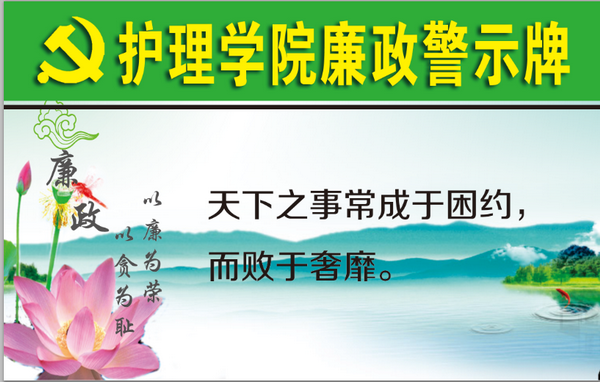 护理学院还通过制作廉政警示牌这一方式,在全院营造廉洁从政的氛围。护理学院从不同途径广泛收集廉洁材料,内容丰富,有“廉政格言警句”、“党和国家领导人‘关于廉洁文化的讲话’”、“廉政诗词”和“党纪政纪”等。警示牌标题醒目,美观大方,给人以美的享受,进一步扩大了护理学院廉政系列活动的宣传面,促进了全院师生“以廉为荣、以贪为耻”的道德风尚的形成。