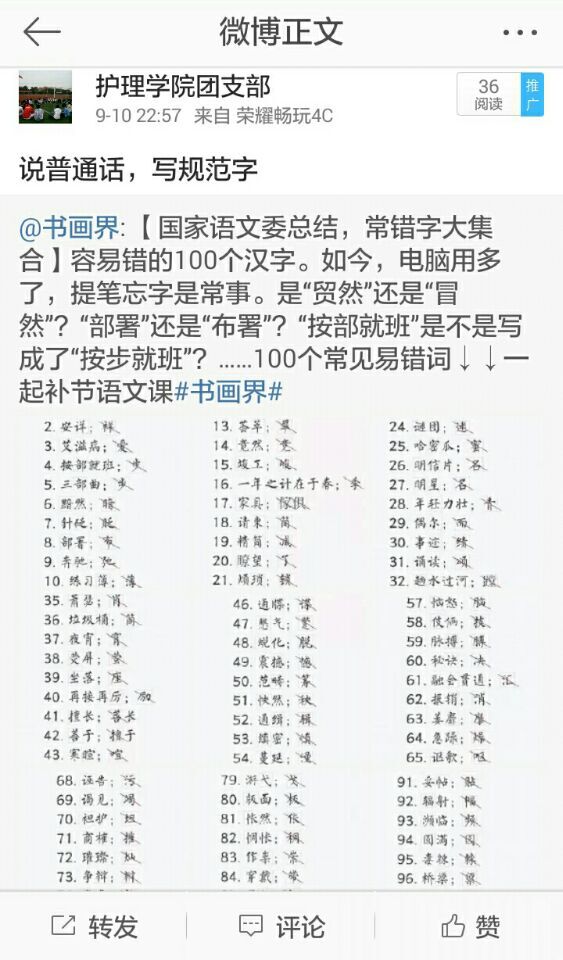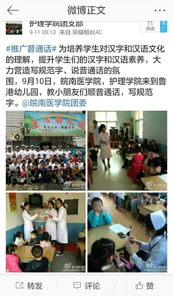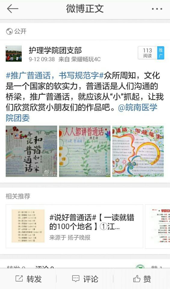 为做好本次活动,学院领导高度重视,召开会议布置活动方案,利用学院团支部微博进行广泛宣传,发布“推广普通话,书写规范字”、“说普通话,从你我开始”、“常错字大集合”等微博带动学生学习普通话积极性。