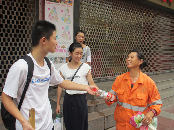 炎炎烈日炙烤着沥青路面,而高温炙烤着环卫工人。8月6日,口腔医学院暑期社会实践团队员们到达合肥市宿州路和淮河路,准备好防暑降温物品,散发给正在高温下工作的环卫工人,或许我们递给环卫工人的只是一瓶水,或一张擦汗的纸巾,但是这对炎热的夏天来说带来了一丝沁凉,当天,队员们还与环卫工交谈,了解她们的生活,体验他们的艰辛。通过这次活动,我们深刻的感受到,她们风里来雨里去,没有夏日的树荫,没有冬日的阳光,只有严寒和酷暑,一双长满老茧的双手换来一座干净的城市,今天的我们应该学会理解学会感恩,理解她们的艰辛感恩他们的奉献。