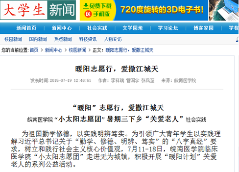 炎炎夏日难掩热诚,滴滴汗水奉献青春。临床医学院2014级“微尘”志愿服务队围绕践行“八字真经”、投身“四个全面”这一主题,立足临床医学的专业优势,关注社会民生热点,奔赴芜湖、合肥、宣城、阜阳、安庆等地积极开展暑期“三下乡”社会实践活动,引起中青网、大学生新闻网、中国文明网、合肥晚报、大江晚报、无为电视台、临泉电视台等媒体的广泛关注,受到实践单位和社会的一致好评。