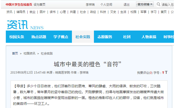 一把普通的扫帚,挥出时代的旋律;一抹橙色的背影,构筑城市的风景。实践队员来到城市角落,探访城市最美橙色“音符”——环卫工人。志愿者们带上茶水,给环工送去清凉;带上热诚,帮他们清洁城市;带上尊重,为他们加油点赞。在清扫马路过程中,实践队员任凭汗水浸湿全身,没有任何抱怨,更多的是对环卫工人艰辛的感激,正是这些人默默的劳动换来了城市的清洁和美丽。在实践中,锻炼品格;在体验中,感悟民生;在奉献中,实现自我,志愿者们的步伐愈加坚定。
