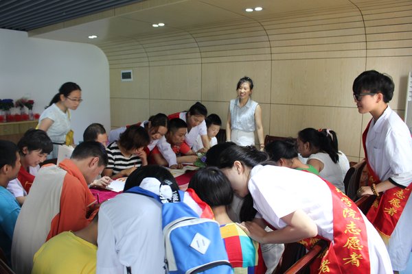 7月14日,心理教研室老师张婷,年级辅导员张欣慧、晋崇政以及2013级应用心理学专业若干名志愿者,来到学院暑期社会实践基地——四褐山街道管山社区与智障儿童进行了友好的互动。