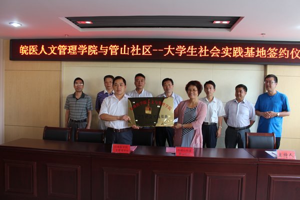 管山社区主任杨吉芝代表社区致欢迎词,诚恳地表达了和皖南医学院人文与管理学院共建大学生社会实践基地的期望,同时她还简要介绍了管山社区的情况。管山社区占地约1.2平方公里,座落在风景秀丽的四褐山脚下,社区围绕“以人为本服务居民构建和谐社区”总体工作目标开展各项服务工作,先后荣获了全国文化先进社区、全国残疾人文化先进社区;省“双百工程”示范点、省低保工作先进单位、省科普示范社区、省社区体育俱乐部、省未成年人思想道德;芜湖市示范社区、第三、五届文明社区、民主法治示范社区、学习型社区、五好居委会、社区民族宗教工作先进集体、芜湖市阳光家园示范点等荣誉称号。王金权介绍了人文与管理学院大学生社会实践、专业特色、学生考研、司法考试等各方面的情况,对管山社区提供大学生社会实践基地这一平台表示了衷心地感谢。随后,双方签订了“大学生社会实践基地合作共建协议书”,并举行了挂牌仪式。