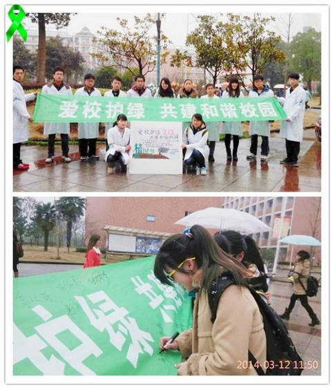 3月,春回大地,万物复苏。在和煦的春风中,在绵绵的春雨里,我们迎来了我国第36个植树节。今年的植树节主题是“拥抱春天,播种绿色”。3月12日中午,临床医学院“绿丝带”志愿服务队在校园内举办了一次以“爱校护绿”为主题的环保志愿活动。