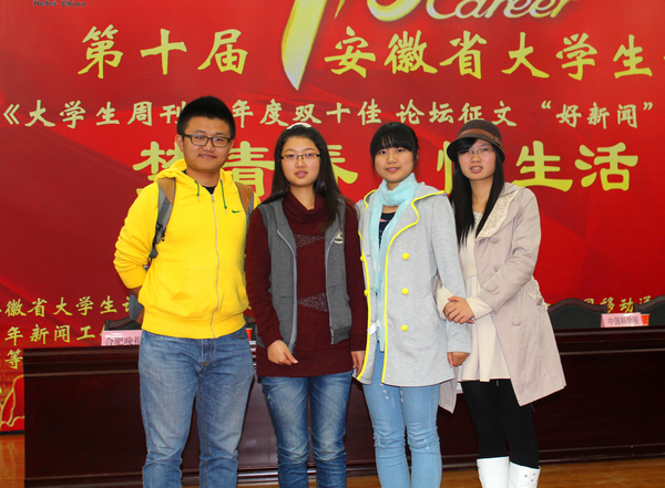 2013年11月10日,第十届安徽省大学生记者峰会在合肥学院举行。全省两百余名学生记者出席峰会,我校学生记者代表吴涵、黄楠、卞福勤、汪振佳应邀参加。会议对第十届“好新闻”作品、省内高校十佳记者等进行了颁奖。我校临床医学院2011级学生、校报记者团团长吴涵获得“安徽省2013年校园十佳新闻记者”称号,影像与检验学院2011级学生汪振佳获得“安徽青年报《大学生周刊》十佳记者”称号,此外,由临床医学院2011级潘星月、药学院2012级周庆、影像与检验学院2012级卢迷撰写的《让知识插上翅膀》获得安徽省第十届“好新闻”言论类三等奖,由吴涵、护理学院2011级郑席席等撰写的《医路花开》获得安徽省第十届“好新闻”通讯类三等奖,由人文与管理学院2012级王雅静撰写的《我想对你说》获得本次峰会的主题征文二等奖。 此次峰会以“梦青春 慢生活”为主题,全省各高校代表在一起交流经验、探讨高校传媒发展趋势。峰会邀请安徽省教育厅思想政治工作处处长张庚家,安徽省学生资助管理中心主任李炳银,安徽青年报社总编辑汪小雅以及安徽医科大学、安徽建筑大学等部分高校宣传部部长,安徽商报、安徽青年报、新安晚报等社会媒体参加,针对高校记者提出的问题给予一一作答。在下午的高校记者交流会上,我校学生记者吴涵对本校记者团的建设发展情况作了介绍,其中提到的新媒体、皖医青梅客户端等特色部分受到了全省各高校代表的一致肯定。 校报记者团自2008年恢复成立以来,牢牢把握正确的舆论导向,切实服务皖医广大师生,传播正能量。通过连续主办两届芜湖市高校记者交流会、开通校园微博平台、加入安徽省大学生通讯社、与《安徽青年报》、《大江晚报》合作供稿,运营皖医青梅客户端,不断扩大学校的影响力。去年5月,校报记者团正式成为全国高校传媒理事单位,学生记者们也借助“百度校媒主编训练营”、“武汉光博会”、“暑期青梅精英汇”等校媒活动走了出去,活跃在校外的舞台上。