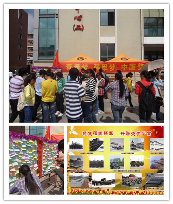 | 为迎接中华人民共和国成立64周年,药学院学子开展了多项活动庆祝祖国华诞。 写祝福强军宣传庆华诞 9月30日中午,药学院学子在皖南医学院新食堂广场前,开展了以“青春梦 强军梦 中国梦”为主题的宣传活动。同学们通过宣传展板向皖医学子们展示了中国人民解放军自建军以来的强军发展历程,展示了我军的辉煌成就,让同学们对国家的威武之师、文明之师、胜利之师充满了信心,对祖国的前程也充满了信心。并请来往的同学们,为祖国的生日抒写自己最真诚的祝福。此次活动集中展示了中国人民解放军的发展历程和辉煌成就,进一步增强了同学们的民族自尊心、自信心和自豪感,也深刻感受到祖国的发展和梦想的力量,激发了大家的爱国热情。同学们纷纷表示:今后要认真学习科学文化知识,提高自身综合能力和素质,实现“中国梦”和“个人梦”的更好结合,以更加昂扬的精神风貌投身到推进祖国的科学发展中去。