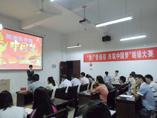 比赛现场 经过初赛、复赛,共有13组选手进入决赛。抽签后,选手依次上台朗诵。选手们时而深情款款,时而激情澎湃,伴随着或舒缓或奔放的配乐声,用标准的普通话,将自己的中国梦娓娓道来,为观众们献上了一场精彩的朗诵盛宴。经过两个小时的激烈角逐,本次比赛共决出一等奖1名,二等奖3名,三等奖6名,优秀奖3名。