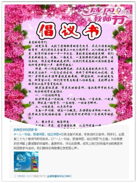 金色九月,秋风送爽,在这个如诗如画的季节里,我们迎来了翘首企盼的第29个教师节。我校团员青年自发组织,以多种形式向老师表达节日的祝福。