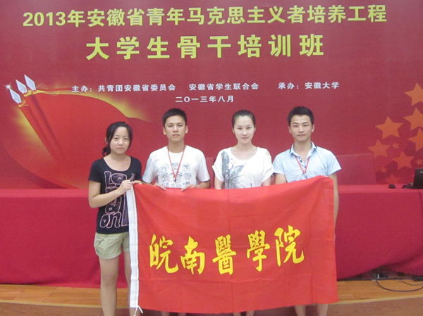 在激情燃烧的八月,我校四名学生干部与省内各大高校的学生干部齐聚安徽大学,参加由团省委、省学联举办的2013年安徽省青年马克思主义者培养工程大学生骨干培训班。 16日-20日,通过专家授课、素质拓展、团体辅导与文艺活动等多元化培训方式,我校学生干部学习了马克思主义中国化和中国特色社会主义理论体系最新成果,与兄弟院校的学生干部交流了学习心得和工作经验,坚定了青年学子为“中国梦”而不懈奋斗的理想信念。