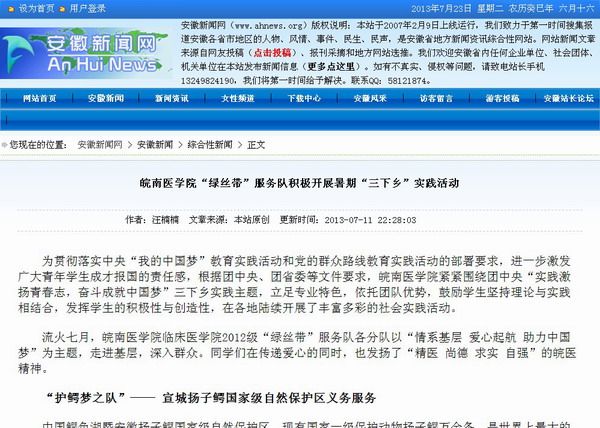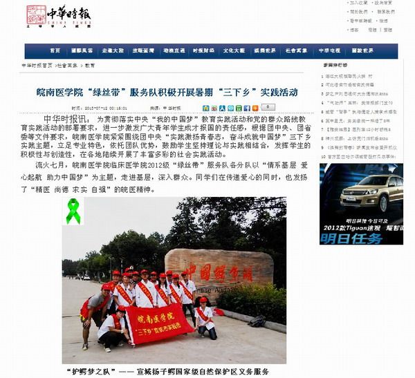 田间地头 服务群众 群众高度评价 媒体跟踪报道 在为期两个月的暑期社会实践中,“绿丝带”服务队情系基层、奉献爱心,在赢得各地群众高度赞誉的同时,也受到了多家新闻媒体的广泛关注。中国教育在线、中国环保网、中华时报、安徽新闻网、芜湖新闻网、大江晚报、黄山在线、172校园活动网等近十家网站、报刊先后对“绿丝带”的实践活动进行了20余次报道,在一定程度上起到了帮助“绿丝带”传递正能量的作用,也扩大了“绿丝带”的社会影响力。