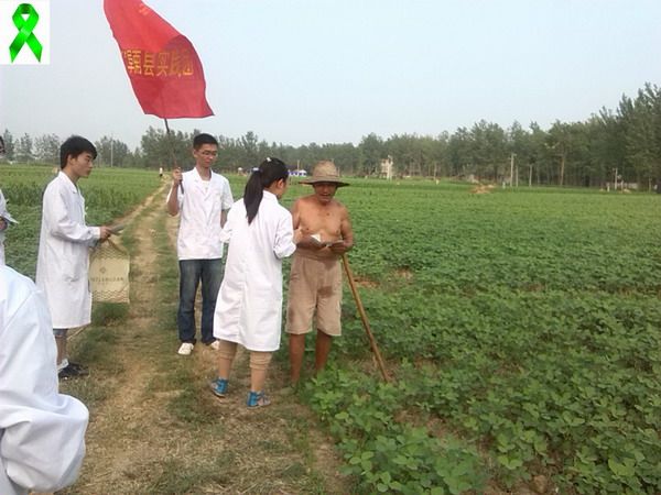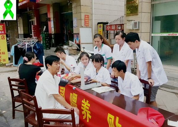 社区义诊 学以致用 克服恶劣天气 酷暑传递爱心 夏日的天像孩子的脸――说变就变,时而烈日当空,时而暴雨滂沱。然而,就是在这样恶劣的天气条件下,“绿丝带”服务队仍然不怕苦、不喊累,坚持投身社会实践。汗水浸湿衣衫的时候,队员们想的是再多为几位群众测量血压;雨水淋湿脸颊的时候,队员们想的是如何快点赶到活动现场开展宣讲会。一份份宣传单、一张张调查问卷,都满载着队员们的爱心和社会责任感;村委会边上的那棵大树、福利院里的那只黑猫,都见证了“绿丝带”队员们的努力和付出。