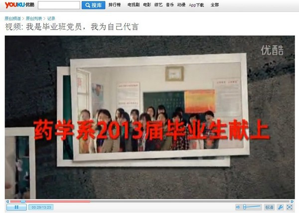在毕业生即将离校的日子里,药学院2013届毕业生充分发挥学生党员的先锋模范作用,围绕 “带上祝福,留下感恩;带上美好,留下文明;带上真情,留下爱心;带上自信,留下期待”的四项主题,开展了系列文明离校活动。药学院学生第四党支部以党员文明离校为主题,精心制作了“我是毕业生党员,我为自己代言”的微电影。该电影长13分钟,记录了毕业生党员在校的学习工作生活,上传到优酷网站(http://v.youku.com/v_show/id_XNTc1MTU3ODQ0.html)。同时,该支部将其刻录在光盘上,赠送给每一位毕业生党员,期待每一位党员带着一份责任和荣耀在新的学习、工作岗位上书写青春、尽显风采。 四年来,药学院第四党支部注秉承“精医 尚德 求实 自强”的校训精神,在继承中创新,开展了大量主题学习实践活动,引领学生党员以实际行动发挥党员先锋模范带头作用,着力提高党员服务意识和服务水平,争先进、做表率,取得了良好的效果。该党支部共有学生党员215名(正式党员164名,预备党员51人),获表彰人次达900余次,考研率达28.8%,就业率达99.5%,实现了“每一位党员为支部添一份光彩”的承诺。