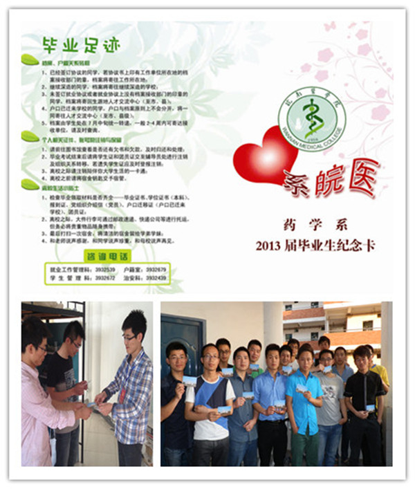 党员工作站 “一份留念”――药学系学生第四党支部精心制作了“心系皖医――毕业生纪念卡”,毕业生党员走入宿舍共发放500余份纪念卡。绿色的纪念卡上,印有对毕业生的温馨提示,包括档案户籍的关系转移、个人相关证件的注销以及离校生活小贴士,详细解释了毕业生的离校手续,卡片的背面以皖南医学院为背景,也为毕业生留了一份纪念。