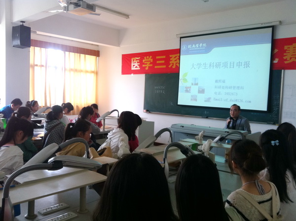 为了让更多的学生积极加入到科研创新队伍行列,为了鼓励学生们积极申报学校大学生科研项目,医学三系于5月10日上午10点在口腔实验中心多媒体实验室举办了大学生科研创新专题讲座。讲座邀请科研处戴照福老师主讲,讲座由医学三系党总支副书记柴琳主持,口腔医学、法医学100多名学生聆听了讲座。