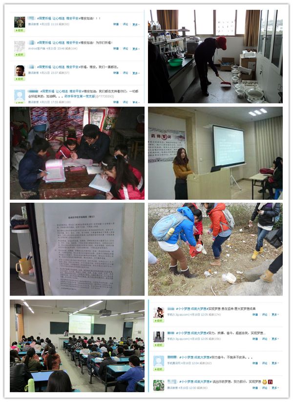 凝聚正能量传递中国爱共圆青春梦 以“凝聚正能量 传递中国爱 共圆青春梦”为主线,药学系学生第一党支部组织学习了新党章;以现场演示、PPT和视频等形式开展了安全教育活动,为共建和谐校园做出贡献;通过微博发表“小小梦想成就大梦想”话题,支部党员通过此平台畅谈梦想,共圆青春梦;得知雅安地震消息,第一时间发表“用爱祈福 让心相连 雅安平安”话题,为灾区人民祈福,凝聚正能量,传递中国爱。