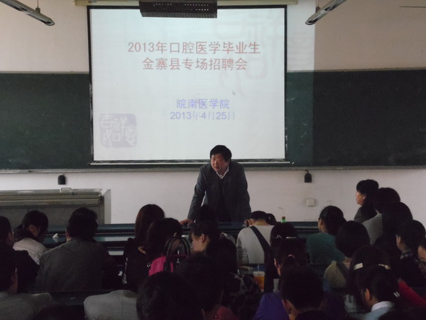 4月25日,中国人民解放军四一一医院院长李曙光、金寨县人力资源和社会保障局副局长汪才贵,金寨县人民医院党总支副书记、人事科长陈君应邀来医学三系举行口腔专业毕业生专场招聘会。