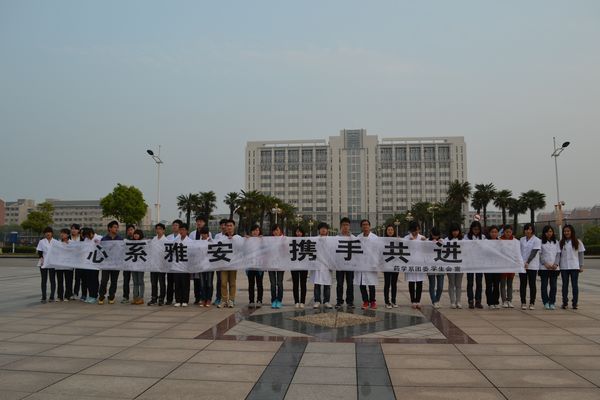 2013年4月20日上午8时02分四川雅安发生7.0级大地震,伤亡惨重,社会各界纷纷伸出援助之手。药学系众多学子也于4月24日傍晚自发地聚集在我校北门,举行“心系雅安,携手共进”祈福活动。