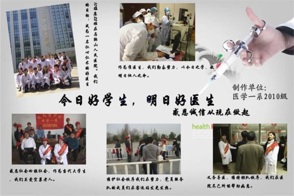 “一流的教育使人终身受益,慈母的关怀让我永生难忘”。正像这句话里说的那样,在105医院里,老师给同学们提供了良好的学习环境,并积极组织同学们参加篮球赛、羽毛球比赛等体育活动以丰富同学们课余生活,从而使他们尽快融入了临床学院的学习生活。为了表达他们对老师的感激之情,同学们为105医院的老师们送去了鲜花与锦旗,并决心今后更加刻苦学习,毕业后用高尚的医德和精湛的医术救死扶伤回报老师、回报社会。 三、制作海报记录点滴成长 围绕着系部近期开展的“感恩 诚信”主题教育活动,结合“学雷锋月”年级所开展的各项学雷锋活动,2010级学生会学生干部们制作了“今日好学生, 明日好医生―感恩诚信从现在做起” 的宣传海报。海报呈现了2010级同学自今年3月以来开展 “走进福利院,关爱空巢老人”、“贴近百姓,宣传预防知识”、“深入医院,义务导医”、“服务医生,感受医术仁心”等学雷锋系列活动的图片,记载了同学们在活动中收获的点点滴滴。同学们通过开展这些活动不仅服务了他人,锻炼了自己,更坚定了今后成为一名优秀医生的决心和信念。