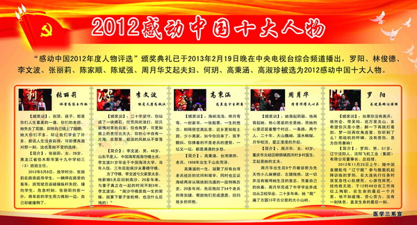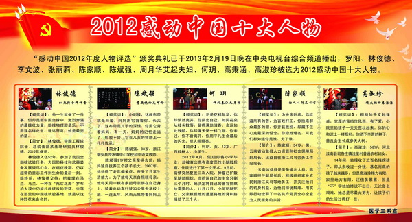 近期,医学三系组织开展学习2012年感动中国人物事迹活动。一是开辟《2012年感动中国人物》宣传专栏,展示十位人物的主要事迹和颁奖词,努力营造学习模范的浓厚氛围;二是组织系七百余名师生观看了2012年度感动中国人物的颁奖典礼,让一个个鲜活的形象,感人的事迹,拨动人们心灵深处最柔软的那根弦。三是组织观后讨论。大家在交流中谈到:感动中国人物大多只是平凡人,而恰恰是这些平凡人,却做出了不平凡的事,在平凡生活中赢得了尊重,成为弘扬民族精神、继承中华优良传统的典范。我们要变感动为行动,以他们为榜样,爱岗敬业、立德树人、无私奉献,努力为学校建设添光彩。