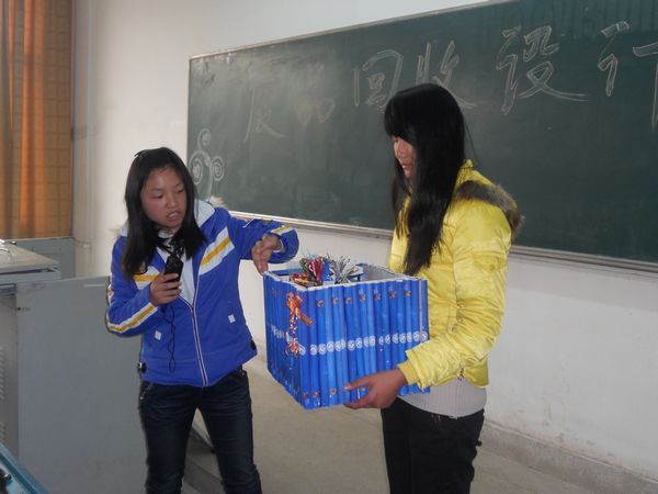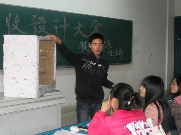 二、厉行节约,旧东西玩出新花样 3月24日下午14时,预防医学系团委于西教203举办废品回收设计大赛。比赛由来自预防11级和12级的共57个小组参加,每组3-4人。在比赛现场,选手们将纸箱、破损的衣裤、饮料瓶,甚至还有废弃的广告单等废旧物品重新利用制作成了笔筒、杂物盒、鞋柜、实用小包等各种精美的手工制品。在作品展示环节中,选手们将自己的作品展现在评委面前,并对作品的创意和用途作了精彩解说,让评委们大开眼界。最终,一等奖由张娇、房雨婷、白丽军、黄静组获得;二等奖由刘保鸿、欧阳伍生、王胜、余克强组和徐欢、陈董凯、左翔、王忆南组共同获得;三等奖由孙伶丽、夏洛媛、张立俊、吴娟娟组,王泽伟、赵阳、李统帅组与李怡君、段梦雪、李凡、李玉组共同获得;另外,王涛、徐欢、方慧获得优秀解说员。本届“废品设计大赛”从环保的角度出发,不仅增强了同学们的环保节约意识,同时也激发了同学们的创新思维,锻炼了动手能力。