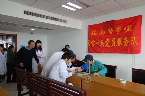 为响应校团委“学习雷锋传递‘正能量’ 志愿服务践行‘中国梦’”的号召,全面贯彻党的十八大和“两会”精神,在实践中深刻体会雷锋精神,医学一系2009级各实习队团支部积极行动起来,开展志愿服务活动。 一、科普宣传、义务医疗 弋矶山医院实习队二队全体队员开展义务医疗活动,宣传医疗卫生常识。测血压,查血糖,听心跳,同学们忙得不亦乐乎。一位老奶奶欣慰地说:“你们做的活动非常有意义,希望以后能经常有这样的机会”。对他们的学雷锋活动予以了充分的肯定,这也成为同学们更加努力学习医学知识、服务社会的精神动力。