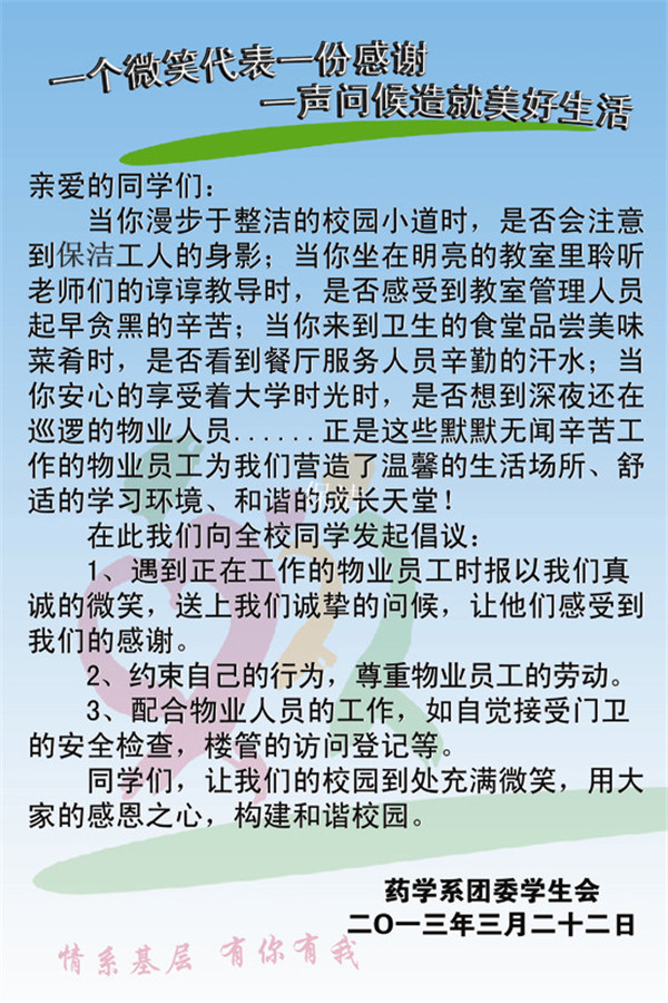 当你漫步于整洁的校园小道时,是否会注意到保洁工人的身影;当你坐在明亮的教室里聆听老师们的谆谆教导时,是否感受到教室管理人员起早贪黑的辛苦......正是这些默默无闻辛苦工作的基层员工为我们营造了温馨的生活场所、舒适的学习环境。为了感谢和关怀这些基层员工,药学系团委学生会于3月开展了“情系基层”活动,为学校的基层职工送去关怀与祝福。