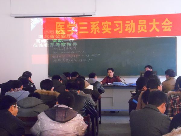 3月4日下午,河北省公安厅一行两人来到我校医学三系,在8号楼召开“河北省2013年公务员考试法医职位招录信息交流会”。 医学三系党总支书记唐传莉、主任陈阳、法医病理教研室教师闫宜峰、辅导员杨丹和部分08级法医专业同学参加了交流会。