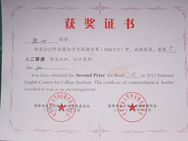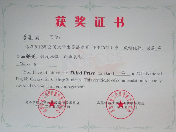 2012年全国大学生英语竞赛NECCS成绩揭晓,人文与管理系2011级三名学生经过努力拼搏,取得了不错的成绩。公管专业黄淑娴同学获一等奖,法学专业陆叶同学、朱爱丽同学分获二、三等奖。