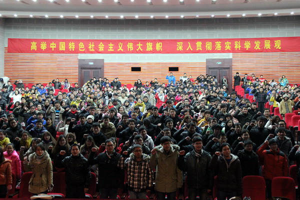 为更好地做好2009级临床医学专业923名学生实习下点前的各项教育工作,12月23日下午,医学一系在新校区大学生活动中心召开实习动员大会暨实习生下点欢送仪式。会议由系党总支副书记王金权主持,系党总支副书记韩军,副主任蒋韶明、吉兆宁、校保卫处治安科科长周黎明、系秘书及2009级全体师生参加了会议。