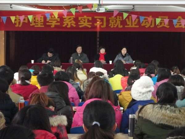 为了进一步做好实习生实习前的思想工作,克服同学们实习前的焦虑情绪,使同学们能了解并尽快适应临床实习生活,护理学系于2012年12月18日上午举行了2009级护理本科实习就业动员会。系党总支书记刘群、系副主任李远珍、实习秘书艾东、2009本科辅导员及全体同学参加会议。艾东主持会议。 首先,刘群书记作了实习就业动员报告,从实习与就业、考研的关系等大家关心的话题进行了阐述。他指出护理学系历年来重视实习实训工作,今年更是加强了对实习医院的开辟工作,在巩固原有的实习基地基础上,又新开辟了北大深圳医院、上海长征医院等六家三级甲等医院作为实习基地,而且与大多数家实习医院达成了“实习就业一体化”意向,在提高实习基地质量的同时,不断提升学生就业层次。刘书记还就实习工作向同学们提出五点要求:一是要摆正心态,找准自身位置;二是要遵守实习纪律;三是要注意人身财产和实习安全;四是要持谦虚认真的态度,虚心向带教老师请教;五是要树立正确的价值观和择业观。 李远珍副主任结合自己多年的护理临床工作经历,细致入微地介绍了实习中可能遇到的问题和应对策略,并从“学习、安全、纪律、形象”四个方面对同学们提出了要求和建议:要求每个实习生端正实习态度,“勤看、勤问、勤练、勤思考”,抓住每一个实践的机会,在不断的练习和操作中自我提升;同时实习期间应做好“六防”工作,注意人身和财产安全;处理好人际关系,同学间应团结互助、共同进步;严格遵循学校和实习医院的有关规章制度;在心态和角色方面尽快做出调整,以“白衣天使”应有的言行举止和精神风貌来严格要求自己;发扬不怕苦不怕累精神,争取在实习之余抓紧时间复习功课,不断强化理论知识,做个实践理论都优秀的实习生,为护理学系争光,为皖医这张名片添彩。