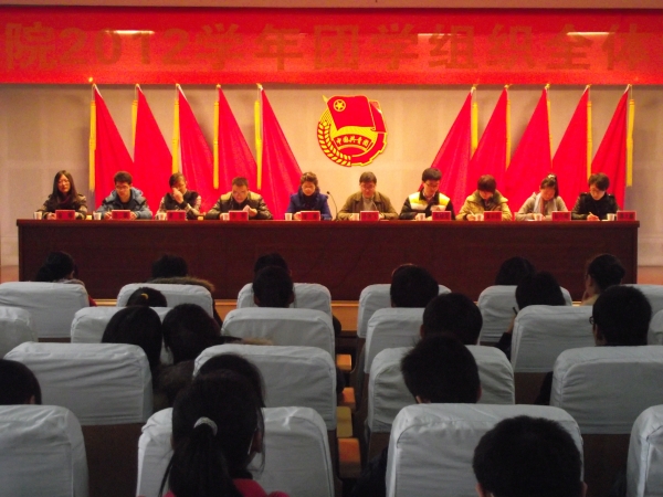 12月5日中午12:00,我校2012-2013学年团学组织全体学生干部大会在图书馆三楼学术报告厅召开,校团委老师和校学生会、校社团联合会、大学生艺术团、大学生礼仪团和校国旗队、校广播站全体学生干部参加会议。会议由校团委副书记许国飞主持。