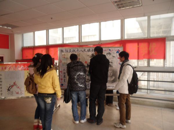 “美化校园环境,彰显时代风貌”志愿服务活动 三、书画展览,共赞盛世 12月3日,医学一系2012级团总支宣传部在图书馆西辅楼二楼门厅举办了“庆祝党的十八大”的书画作品展,寄托和表达了同学们对党的深厚感情和对十八大胜利召开的喜悦之情,展示了2012级临床学子的别样风采和积极向上的精神风貌。 本次书画展获得了医学一系2012级同学的大力支持,展出作品数量众多、内容积极、形式多样。其中,书法作品囊括了篆、隶、钢笔字,绘画作品也涵盖了山水、花鸟、素描、漫画等不同种类,更有书画合璧的优秀作品分外夺人眼球。 精美的书画作品吸引了很多同学驻足欣赏,流连忘返。同学们都饶有兴趣地欣赏着展出作品,品味着作品的内涵,相互交流体会,还有同学在展板前与自己喜欢的艺术作品合影留念,将艺术的美好与青春的激情定格在记忆中。