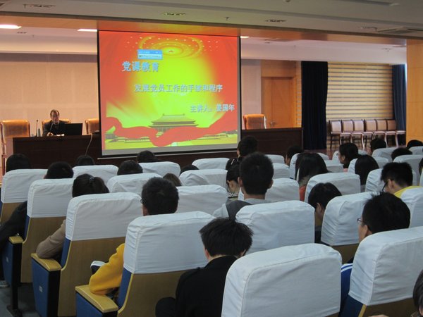 近期,为落实党的十八大和校第七次党代会精神,抓党建,促发展,人文与管理系师生同庆,积极开展“爱党、爱祖国、爱社会主义”的“三爱”教育活动。 一、学生第四党支部开展党课教育学习 11月12日下午,系2011级学生第四党支部在图书馆三楼报告厅开展党课教育学习,校关工委委员、系关工委副主任姜国年应邀作报告,会上,姜国年老师回忆了中国共产党改革发展的光辉历程,围绕“十八大”的精神,向同学们介绍了“发展党员工作的手续和程序”,详细讲述了 “当代大学生如何成为一名合格的共产党员”。 会后,学生第四党支部书记王远芳要求该支部全体成员“端正入党动机,不断学习,提高思想觉悟,积极向党组织靠拢”,目前,第四学生党支部入党申请书的递交率已达100%。