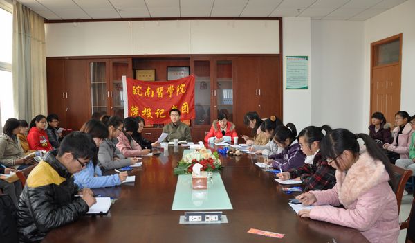 2012年11月28日中午,校报记者团召开年度工作总结暨优秀记者表彰会议。宣传部副部长陈抗震、宣传科科长张卉、校报编辑部主任任苔蓉和全体校报记者参加会议。 会议总结了2012年记者团工作。一年来,记者团在部门负责人的关心和相关部门的支持下,在全体学生记者的共同努力下,团内机构基本健全、社团活动逐步规范、活动的主题更有特色、活动的质量显著提高,加强了与校外媒体的合作与交流,促进了自身发展。 会议表彰了蔡瑞婷等8名优秀团干,卞福勤等6名优秀记者,宣传部副部长陈抗震为获奖同学颁发了获奖证书。2012年9月,经过层层选拔,通过笔试、面试,21名新生加入到校报记者团,宣传科科长张卉为新生记者颁发了记者证。 优秀团干代表孙盼盼发言,抒发了两年来在记者团工作的感受和体会,和新生记者分享了新闻写作和社会实践等方面的成功经验。新生记者代表张肃发言,表示要珍惜机会,充分利用好校报记者团这一平台,全面锻炼自己,为学校的舆论宣传工作作出自己的努力。 宣传部副部长陈抗震讲话,他肯定了记者团一年来的工作,指出,校报记者团全体成员凝心聚力、团结协作、扎实工作,在团内建设和个人能力上都有明显进步。为了进一步提升学生记者工作水平,把自己锻造成各方面优秀的综合型人才,他提出,全体记者要力求做到“博学之,审问之,慎思之,明辨之,笃行之。”“博学之”,就是要加强学习,向书本学习,向实践学习,向老师和身边的同学学习,广泛涉猎,多方汲取,积累深厚的知识底蕴。“审问之”,就是要善于观察,保持对周围事物的浓厚兴趣,不断调整观察视角,结合形势特点,撰写富有独到见解的稿件。“慎思之”,就是要将“眼中之竹、胸中之竹、手中之竹”三个阶段完美结合,精心构思,创作出优秀作品。“明辨之”,就是要明确立场,牢牢把握正确的舆论导向,作公正客观的报道。“笃行之”,就是要增强实践意识,主动深入社会,了解社会,把握时代脉搏,敢于下笔,勤于写作,在实践中不断提升自己。他希望广大记者切实履行职责,关注校园点滴,挖掘亮点,宣传典型,架构师生交流的桥梁。 会上,全体记者团同学面对团旗庄严宣誓,表示要珍惜岗位,服务师生,用事实说话,用镜头去捕捉精彩的瞬间,用文字去记录新闻故事,用热情谱写生命的弦音。 会议还进行了团干竞职演讲,并选举产生了新一届记者团团干。