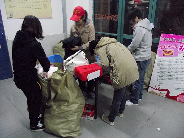 11月17日下午,由校团委、学生会和学生社团联合会共同举办的“喜迎十八大”爱心捐赠活动在我校各栋宿舍楼门口展开,接受师生的爱心捐赠。