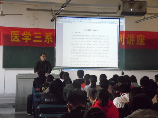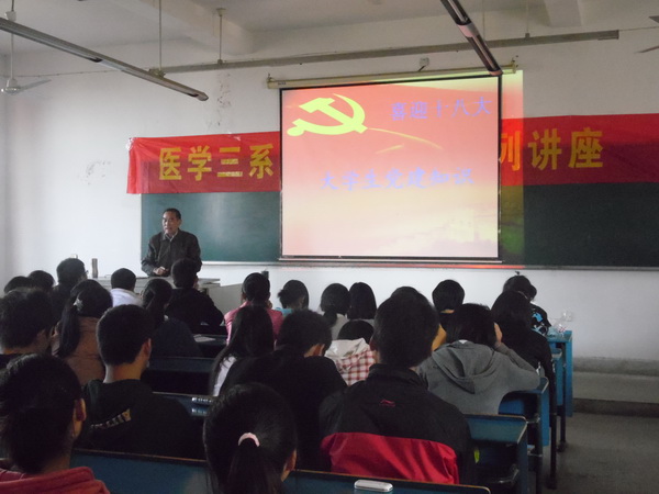 在党的十八大即将召开之际,医学三系分别于2012年11月6日下午和11月7日上午在西教304、102举办了关工委专题讲座。校关工委曹士珍老师为同学们作《大学生党建知识》、校关工委黄金余老师作了《中国在国际形势中的地位》两个讲座,讲座分别由医学三系主任陈阳、党总支副书记柴琳主持,医学三系2012级全体同学聆听了讲座。