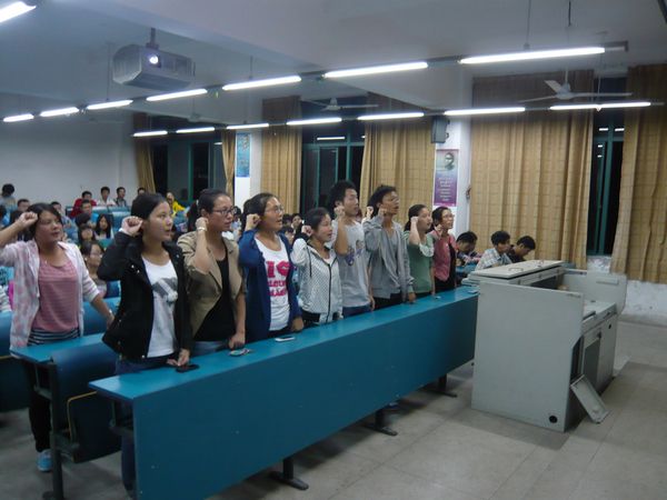 为了迎接党的十八大隆重召开,进一步激发学生的爱国、爱党热情,提高新一代大学生的综合素质,促进当代大学生的全面发展,金秋十月,预防医学系团委开展以“迎着党旗 跟党走”为主题的“五个一”活动,深入贯彻落实党的十八大精神,营造昂扬向上、团结奋进、开拓创新的良好氛围喜迎党的十八大的胜利召开。 一、看一场爱国影片 重温入党誓词 10月12日,预防医学系学生党员和2012级新生100余人在西教201举行“重温入党誓词,观看爱国电影”的活动,观看电影前,学生党员起立并宣读入党誓词,激情高亢的气势与真挚诚恳的誓词内容感染了在座的每一位大学生。当晚,播放爱国电影《忠诚与背叛》和《听风者》,剧情围绕着先烈们与敌特斗智斗勇解放新中国的主题,情节感人紧凑,将先烈们的英勇无畏刻画得淋漓尽致。同学们感动得热泪盈眶,认识到新中国幸福生活的来之不易,纷纷表示要努力学习科学文化知识,为以后报效祖国,服务人民做好准备。