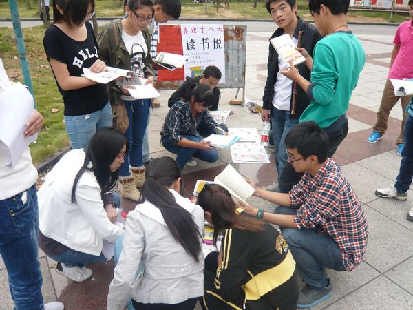 三、举办一次“读书悦”活动 交流爱书心得 10月14日,预防医学系团委开展“读书悦”交流好书活动,获得各年级同学的大力支持和响应。学生会干部在活动开始前走访每个学生寝室,对本次活动大力宣传,并对图书、杂志、学习资料等书籍进行统一回收并归类,于14日下午在老食堂门口进行图书交换,前去的同学可以挑选自己感兴趣的书籍进行借阅,活动现场人头攒动,甚是热闹,不仅丰富校园文化生活,还在节约环保的理念下实现了资源共享。
