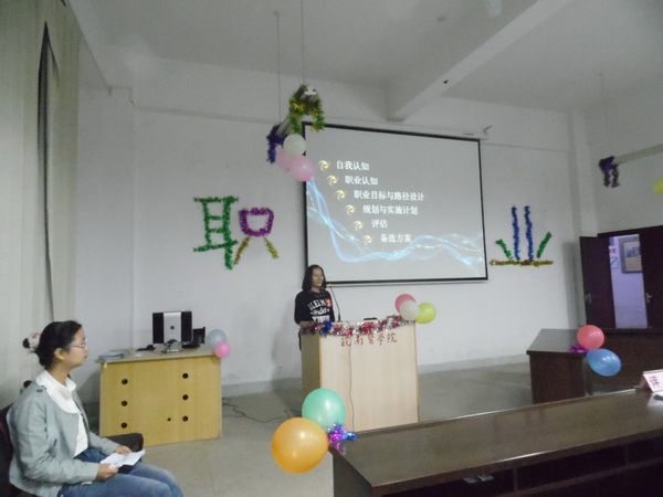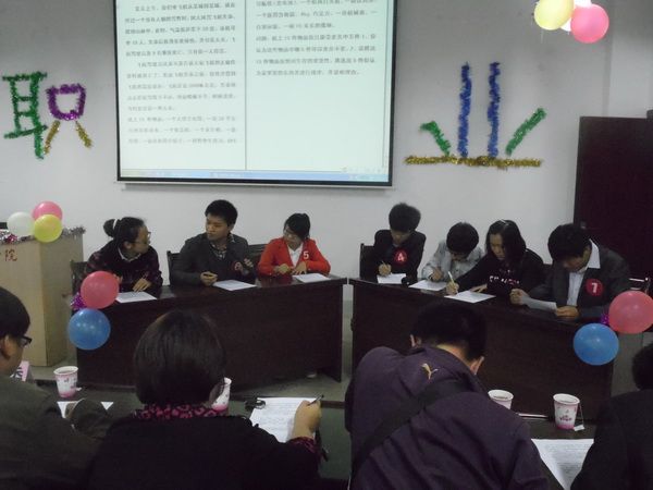 角色模拟 比赛中,选手们通过职业生涯规划PPT演示、现场答评委问、无领导小组讨论、职业角色模拟等环节,充分展现了各自对未来的设想。尤其是创业组,选手们阐述了自己的经营模式、营销策略、市场分析、产品服务等计划,解说自己的创意,结合自己的专业特点,科学规划自己的未来。在选手的自信展示和观众的热烈掌声中,评委们对选手的表现进行了精彩点评。2011级程晨、张静组合获创业组第一名,王晓玉同学获就业组第一名。