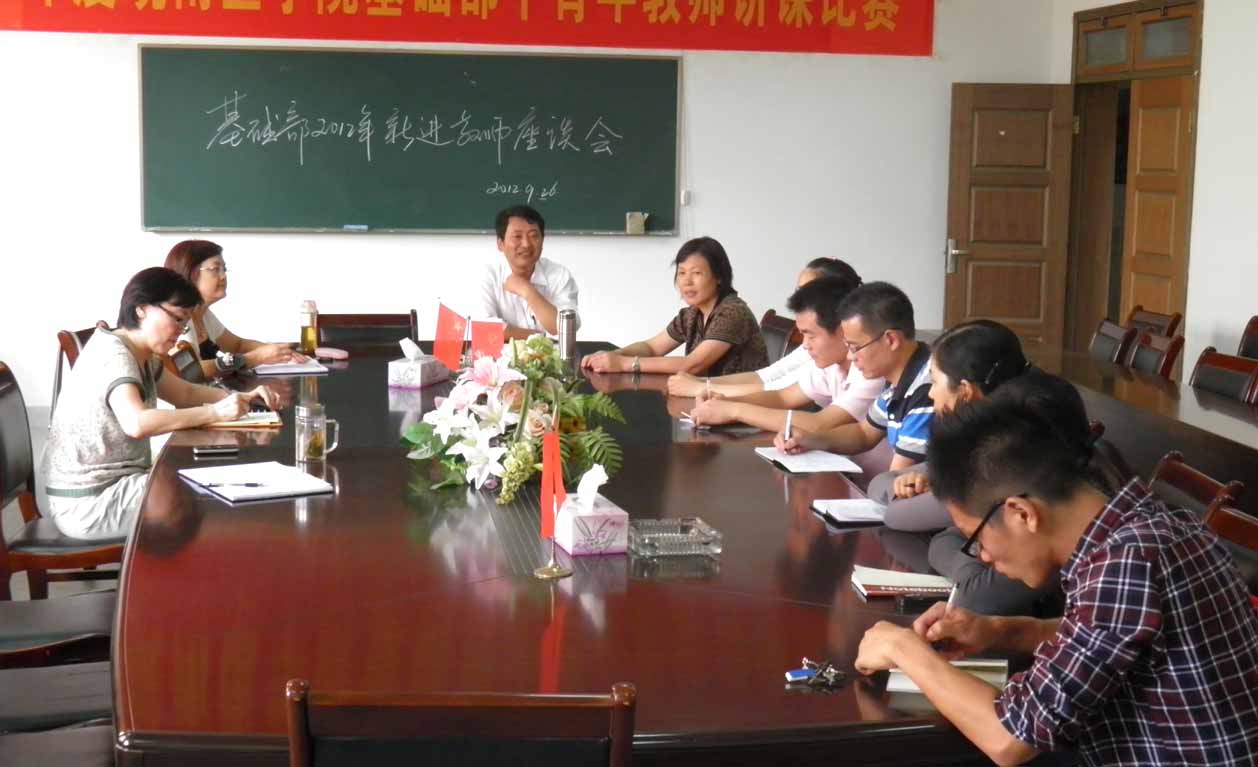 9月26日下午,基础部在会议室举行了2012年新进教师座谈会,6位新进教师参加了会议,基础部全体班子成员出席会议。 张根葆主任介绍了基础部教学、科研、学科建设等方面情况及学院发展概况,要求广大青年教师尽快进入角色,利用现有条件,从基础做起,扎实开展好教学和科研工作,早日成长为各自岗位上的骨干。基础部其他班子成员分别就党务、教学、行政事务作了介绍,并提出期望和要求。 新教师分别作了简短的自我介绍,表示将珍惜现有条件,努力扎实地做好本职工作,根据本部门的具体情况,务实地制定培养计划和个人发展规划,力求做到教学、科研全面发展,为学院的发展奉献自己的一份力量。