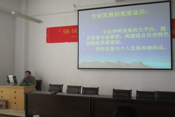 为扎实推进“保持党的纯洁性、迎接党的十八大”主题教育实践活动,凝聚人心,共谋发展,人文与管理系以“抓党建、创和谐、促发展”为主题,精心策划了“五个一”活动。9月10日下午,在全国第28个教师节之际,顺利开展了“五个一”活动之“做优秀皖医人”先进事迹报告会和“第二十八个教师节联欢会活动” 。 在先进事迹报告会上,系党总支书记阮笑芳、主任胡鸿、副书记刘华、副主任王军和全系教师参加了报告会。副主任王军主持会议。心理学教研室主任刘新民教授首先作了题为“架起高校与公众之间的桥梁――探寻心理学的应用之路”的报告,报告从“心理学有什么作用”、“两个真实的案例”、“目标与定位――追求个人、集体、社会需要的和谐”、“效果”、“体会”等方面,讲述了他如何将心理学理论服务于公众,架起了高校和社会之间的桥梁,得到了高校和公众的广泛认可。报告内容深刻,发人深思。保险教研室主任俞彤副教授为大家作了题为“立足专业岗位、构建职业生涯发展”的报告,他提出了以系统论观点构建个人专业发展与学术生涯的论点,要立足学科发展的大平台,提升自身专业素养,构建适合自身特色的职业发展规划,指出学科发展要与个人发展相辅相成。观点独特,视角新颖。系青年教师代表、校教学比赛三等奖获得者王冠男老师做了题为“以人为师,以生为本――青年教师成长心路”,用朴实的语言讲述了作为一名青年教师是如何转变角色,用心教学,以生为本,实现自己人生的飞跃。医学二系省级优秀辅导员饶婷婷老师作了题为“在学习中不断进步”的报告,声情并茂的讲述了自己如何从“菜鸟级”辅导员起飞,成长为一名能够应对复杂局面、处理各类问题的学习型辅导员。该系校级优秀辅导员王远芳老师为大家作了题为“心系人管学子,爱创未来”的报告,介绍了她以创建优良学风为导向,以科学管理为方法,将爱心和责任心紧密结合,所带班级各项成绩突出。