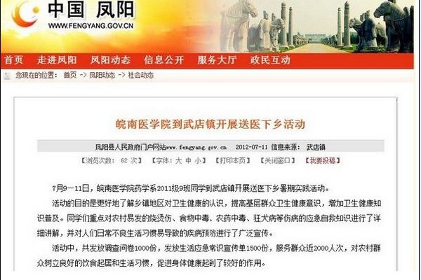 3、完善专业知识 开展社会调研 暑假期间,我系学子为进一步完善专业知识,开展了一系列调研活动,如“宣传药学知识 义务量血压”实践活动、“参观家乡医院 学习药学知识”专业实践活动、“青少年学习压力与心理健康调研” 活动等,其中,11级社会实践队联合凤阳县武店镇计生办、武店镇团委,开展了以“享受健康 珍爱生命”为主题的送医下乡社会实践活动,重点对农村易发的烧烫伤、食物中毒、农药中毒、狂犬病等伤病的应急自救知识进行了详细介绍,受到了当地群众和地方政府的热烈欢迎,引起了当地媒体的高度关注,凤阳县人民政府网站也对此进行了相关报道。