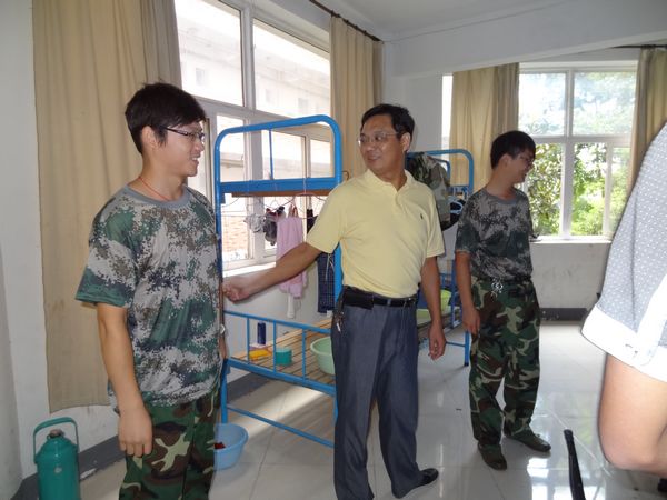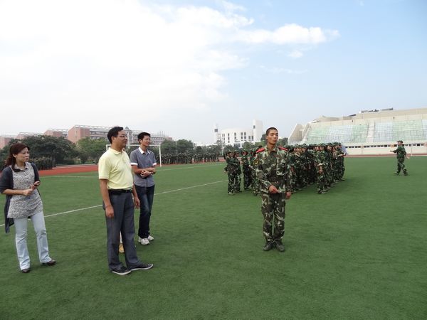 为鼓舞新生军训斗志并了解新生在校生活情况,9月14日上午,药学系主任吴少云,党总支副书记李康才、赵梅,系秘书魏魏、王爱侠,新生辅导员张叶明、刘书琴老师等来到田径场看望正在军训的2012级药学系新生。领导老师们一一查看了每个方队的进展情况,在教官们严格规范的指导下,各个连队队列整齐、步伐统一。吴主任对新生军训风貌非常满意,同时对参加军训的教官表示表示亲切的慰问和真诚的感谢。在与新生的交谈中,吴主任强调军训是进入大学生活的第一堂课,对以后适应大学的学习和生活有重要意义,希望同学们能够把握这次军训体验,养成良好的习惯,培养自己顽强的毅力,形成团结的集体观念,同时嘱咐辅导员要时刻关注受训学生的身体状况,确保军训学生的安全。