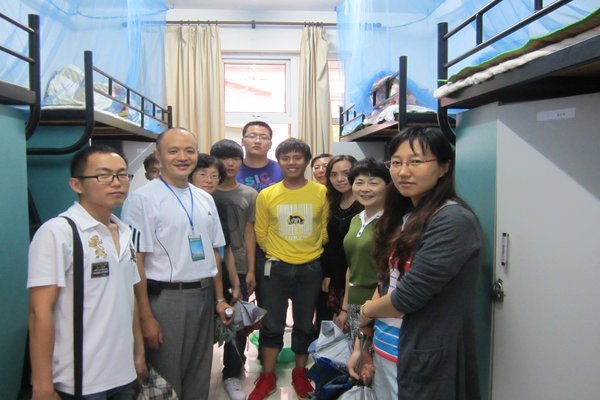 9月9日中午,人文与管理系党总支书记阮笑芳、副书记刘华、副主任王军、系秘书吴映辉、国实和新生辅导员邵峰冒着淅淅沥沥的秋雨深入学生宿舍,看望2012级新生,给新生和新生家长送去慰问和关怀。