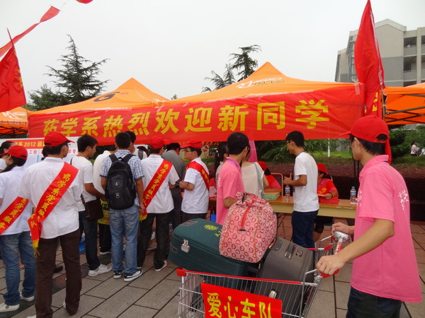 四、爱心车队暖人心 针对很多新生和家长远道而来,旅途奔劳,行李又很多,十分疲惫的特点。药学系青年志愿者在系领导的大力支持下,经过精心策划,筹集到20辆超市推车,组成了一支帮助新生搬运行李的“爱心车队”, 帮助新生将行李运到宿舍和领取卧具。这一温馨的举动让新生和家长感到了学校的关怀。