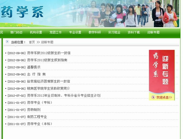 经过两天紧张有序的忙碌,药学系2012年迎新工作现已圆满结束。为切实做好2012年迎新工作,药学系坚持“以人为本”的原则,本着“一切为了学生,为了一切学生,为了学生一切”的理念,开拓创新,展开了多项贴近新生、贴近生活的温馨措施来为广大新生打开一扇温暖如家的大学之门。 一、提前谋划,让新生在未进校前就了解入学流程 药学系在新生报到前,就专门在系部网站开设了 “迎新专题”内容包括“致新生家长的一封信”、“出行指南”、“2012级新生报到指南”等,让2012级新生在家期间就能通过网络了解整个入学流程。