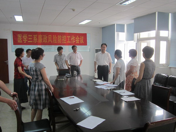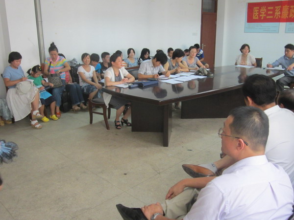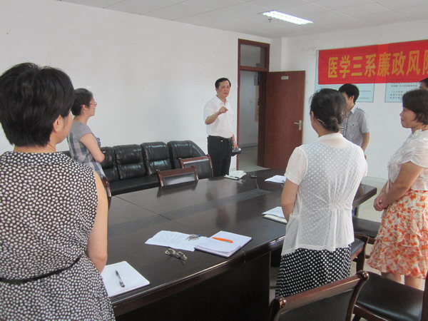 李朝品副院长在现场检查指导新学期教学安排 8月31上午,医学三系总支书记唐传莉主持召开系党政联席会与总支扩大会议,总结暑期工作,研究部署新学期开学安排,并宣传贯彻我校第七次党代表大会筹备等相关文件精神,布置我校党代表选举工作。唐传莉书记传达了校党委与行政中层干部会议精神,要求三系各支部与各教研室、各年级,严格按照学校有关要求,扎实细致地做好校“两委”委员候选人推荐及校党代会代表推荐选举、期初教学检查、教研室教学准备、老生返校报到注册、迎接2012级新生等各项工作。