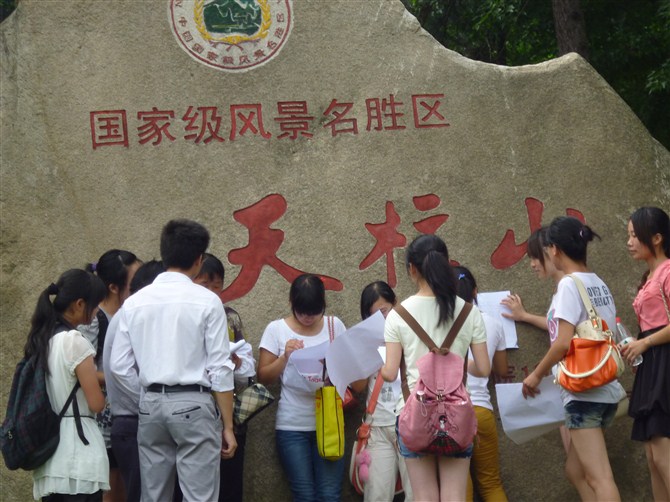 为增强大学生社会责任感,帮助大学生树立正确的人生观、价值观,培养大学生社会实践能力。护理学系2011级本科在暑假期间积极开展了一系列社会实践活动。 2012年7月6日上午,安庆实践队一行8人来到天柱山,通过发放问卷的方式,在景区内和相邻的村镇进行生态旅游的有关宣传和调研,提高人们对于生态旅游的关注程度,增强人们保护旅游资源和环境的意识。另外,结合专业优势,宣传夏季常见病防治、炎热天气防暑小知识、生活小常识等,提高人们的医疗保健意识及水平。