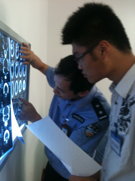 学习分析颅脑CT 刑警支队的领导老师们对法医专业的同学非常关心,提供了不同的资源以供学习,和08级实习的同学一起,进入了现场组,门诊组,受理组,DNA和毒化组的进行学习。截止目前,队员们多次与公安干警深入现场,在市局实习带教老师指导下书写规范鉴定书,各方面专业能力得到提升。 (张天叶/文、摄 柴琳、张卉/审) |